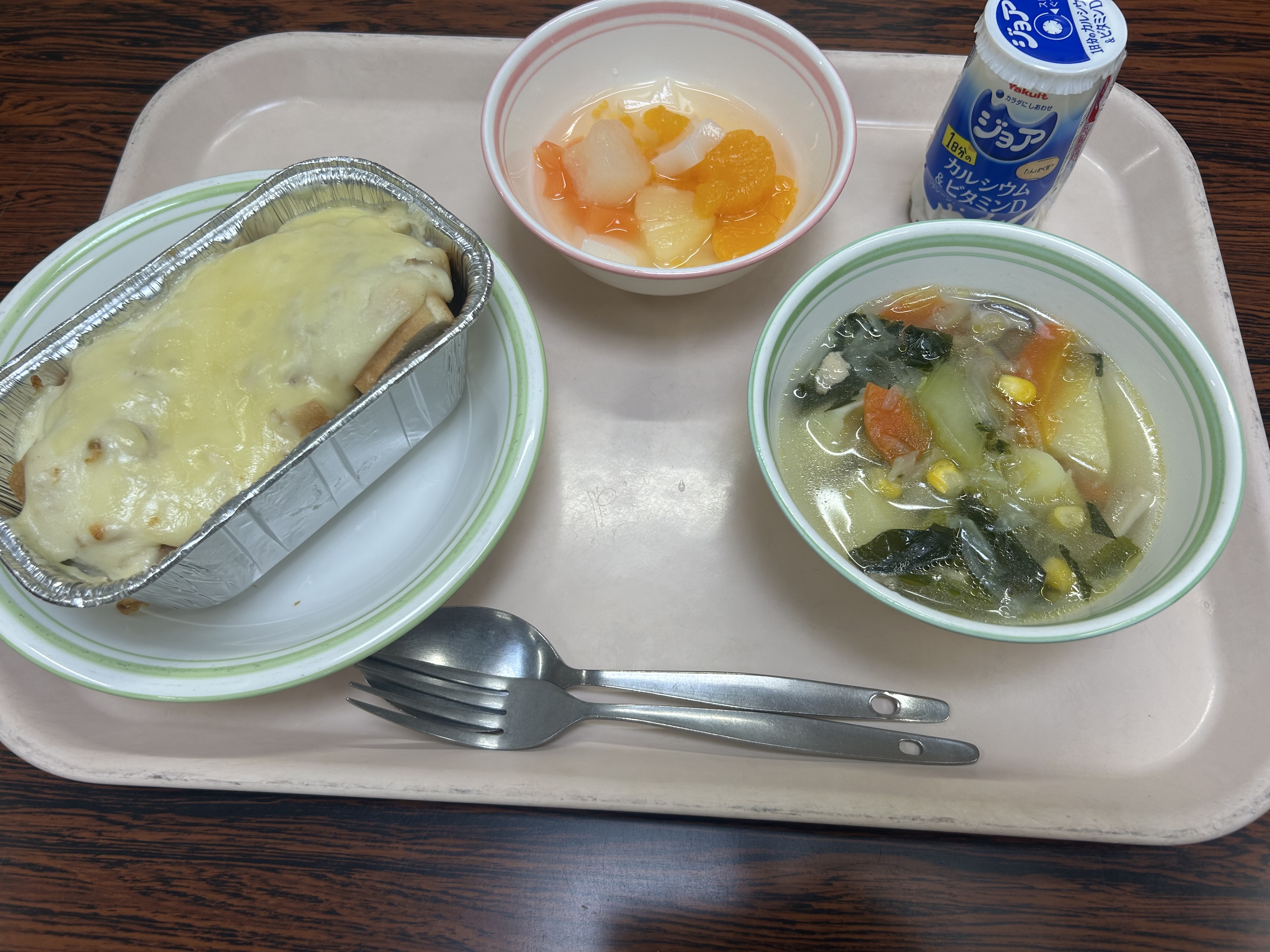 【3月2日(月)】 ・パングラタン ・ジョア ・具だくさんスープ ・お祝いデザート |